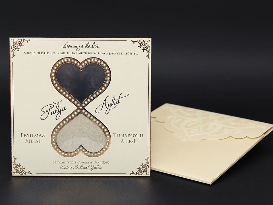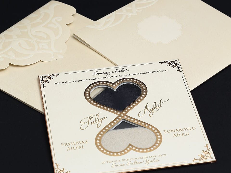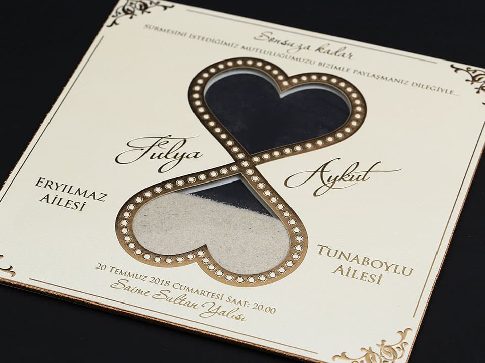 Inner print of the invitation includes the printing of the bride and groom names, invitation text, family names, date, time, and address information on the inside of the invitation.