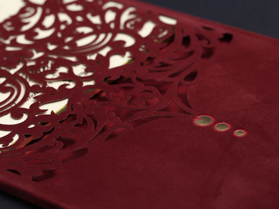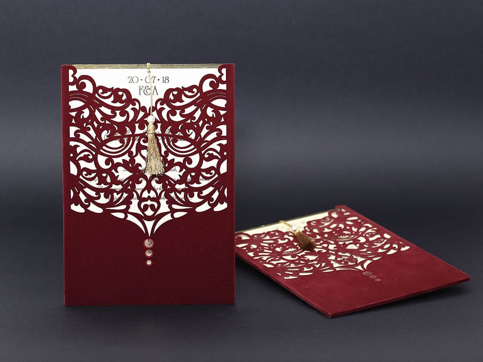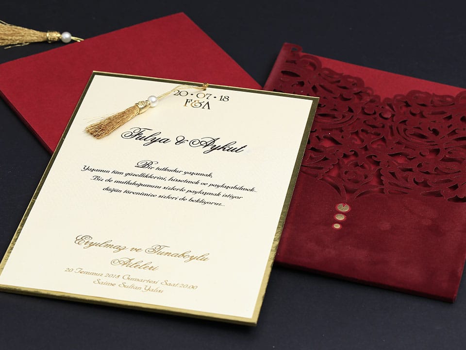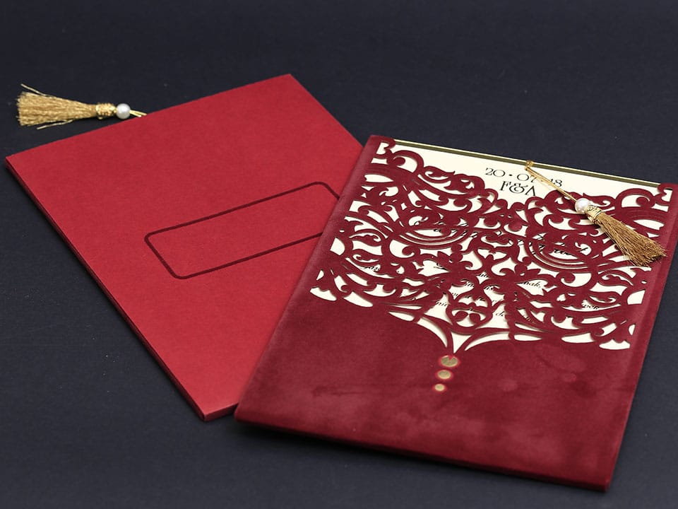 Inner print of the invitation includes the printing of the bride and groom names, invitation text, family names, date, time, and address information on the inside of the invitation.