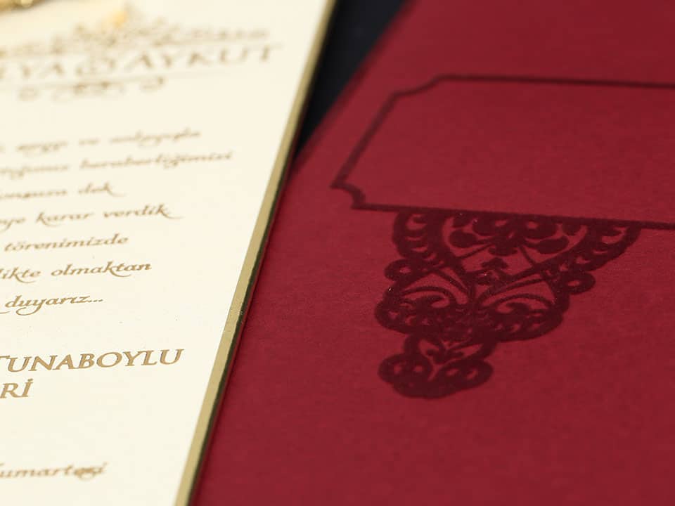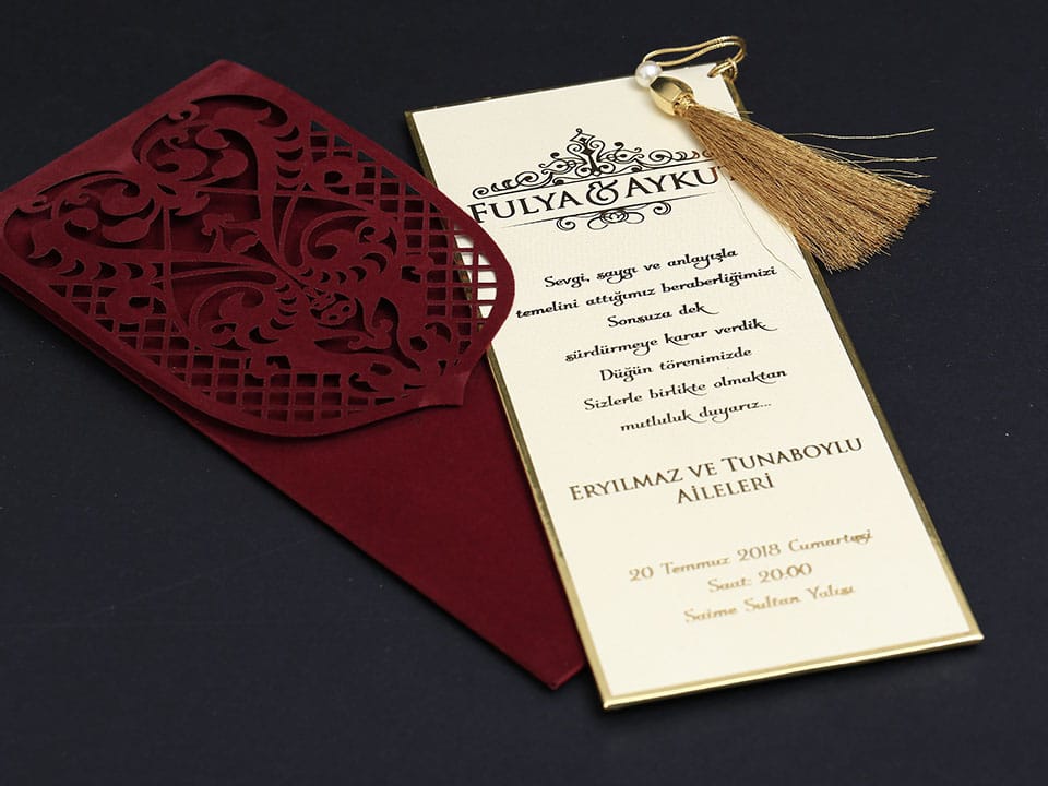 Inner print of the invitation includes the printing of the bride and groom names, invitation text, family names, date, time, and address information on the inside of the invitation.