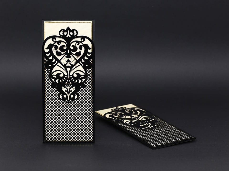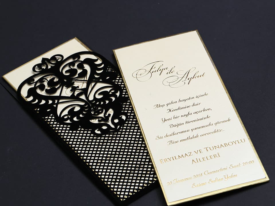 Inner print of the invitation includes the printing of the bride and groom names, invitation text, family names, date, time, and address information on the inside of the invitation.