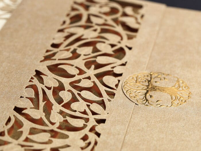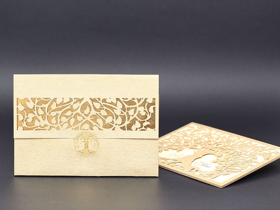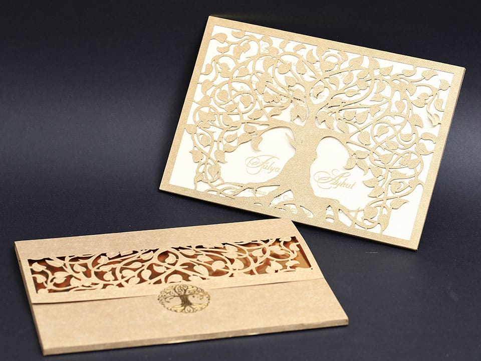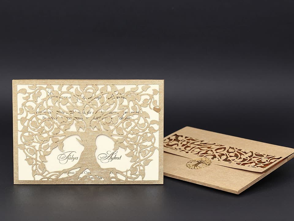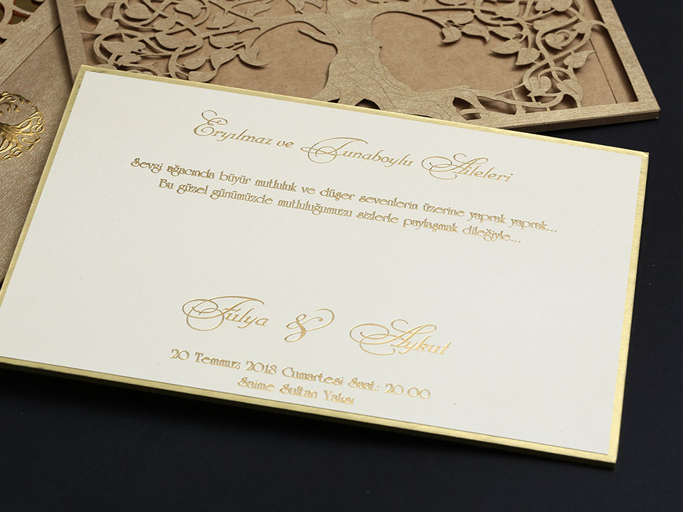 Inner print of the invitation includes the printing of the bride and groom names, invitation text, family names, date, time, and address information on the inside of the invitation.