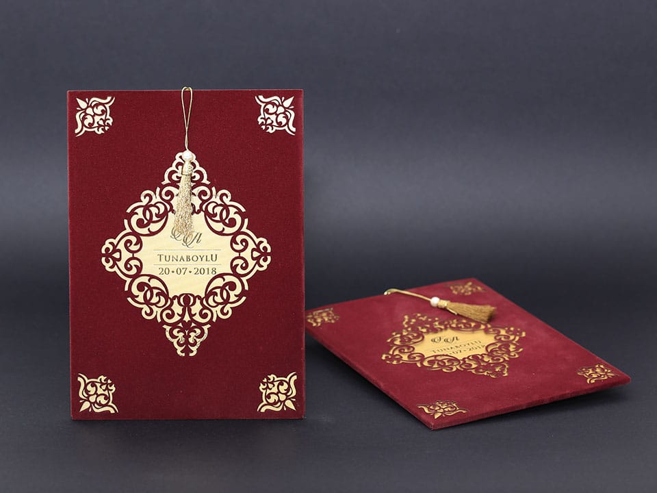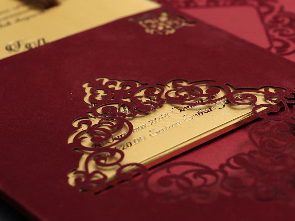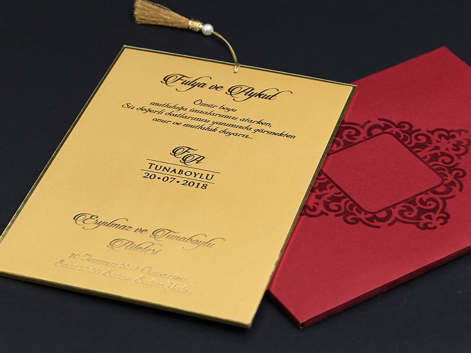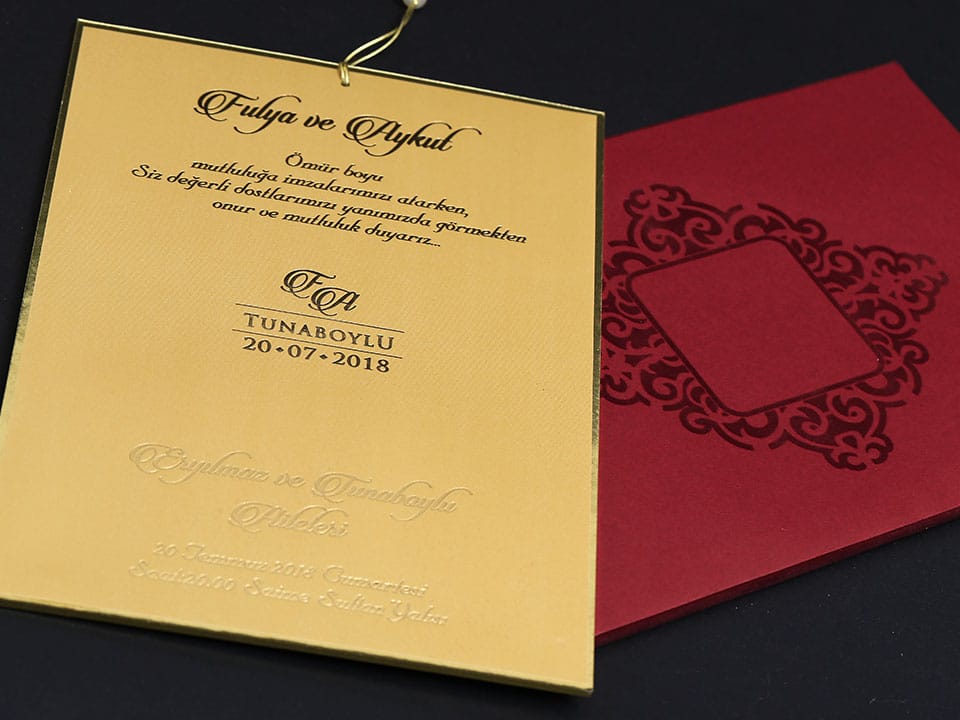 Inner print of the invitation includes the printing of the bride and groom names, invitation text, family names, date, time, and address information on the inside of the invitation.