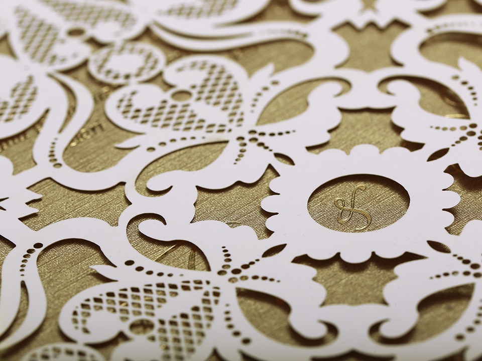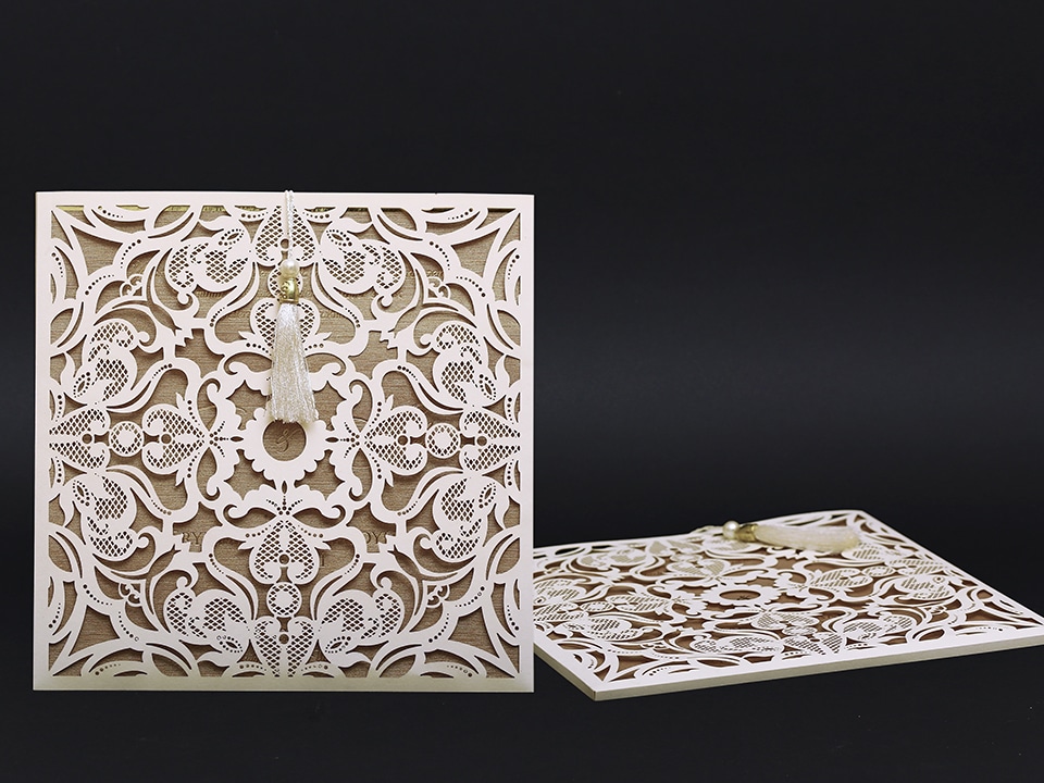 Inner print of the invitation includes the printing of the bride and groom names, invitation text, family names, date, time, and address information on the inside of the invitation.