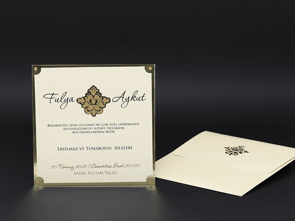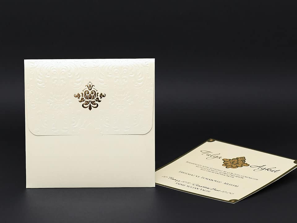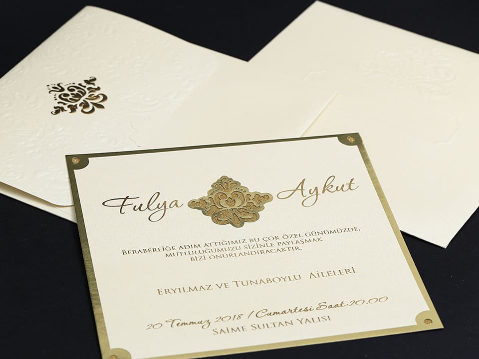 Inner print of the invitation includes the printing of the bride and groom names, invitation text, family names, date, time, and address information on the inside of the invitation.