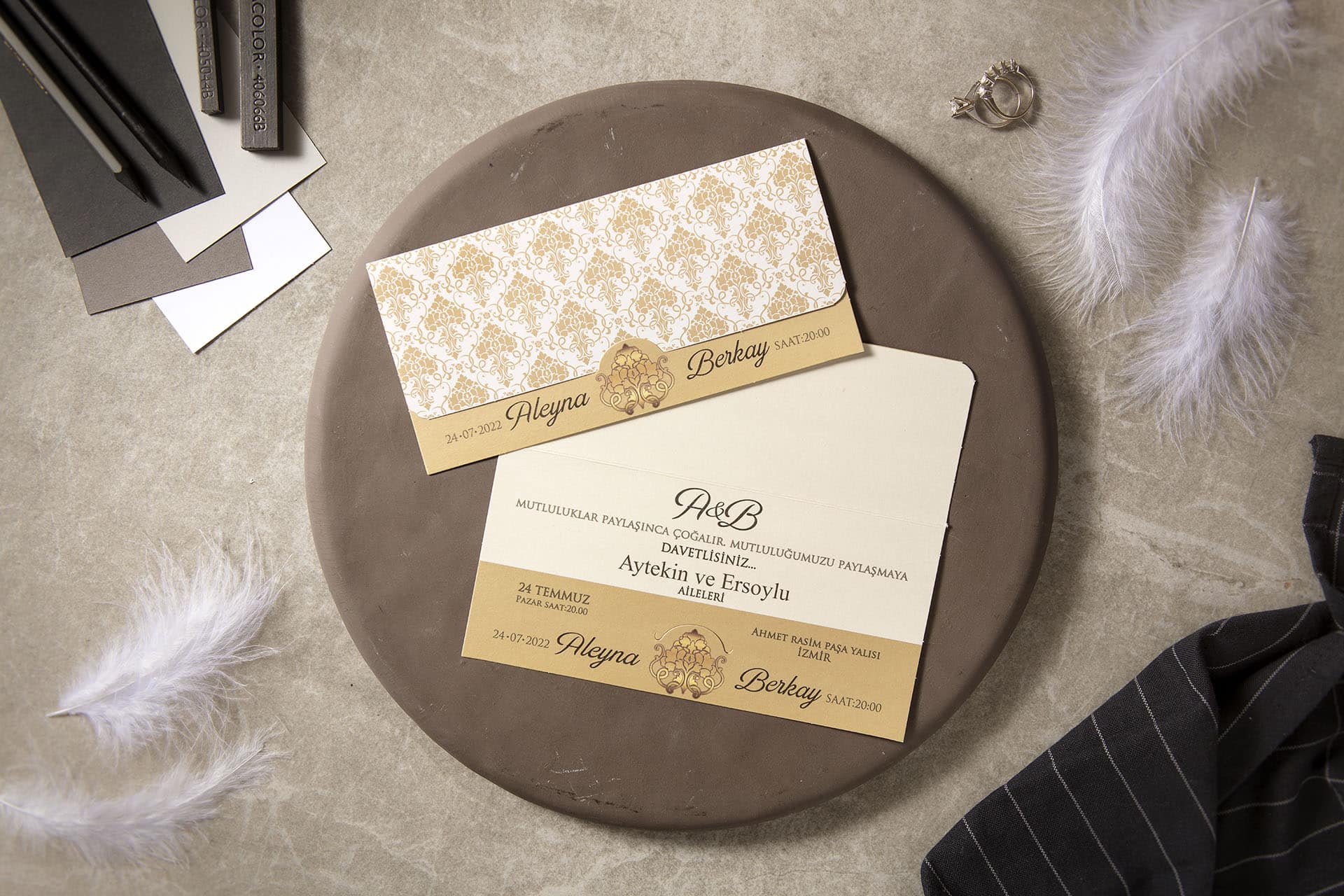 Inner print of the invitation includes the printing of the bride and groom names, invitation text, family names, date, time, and address information on the inside of the invitation.