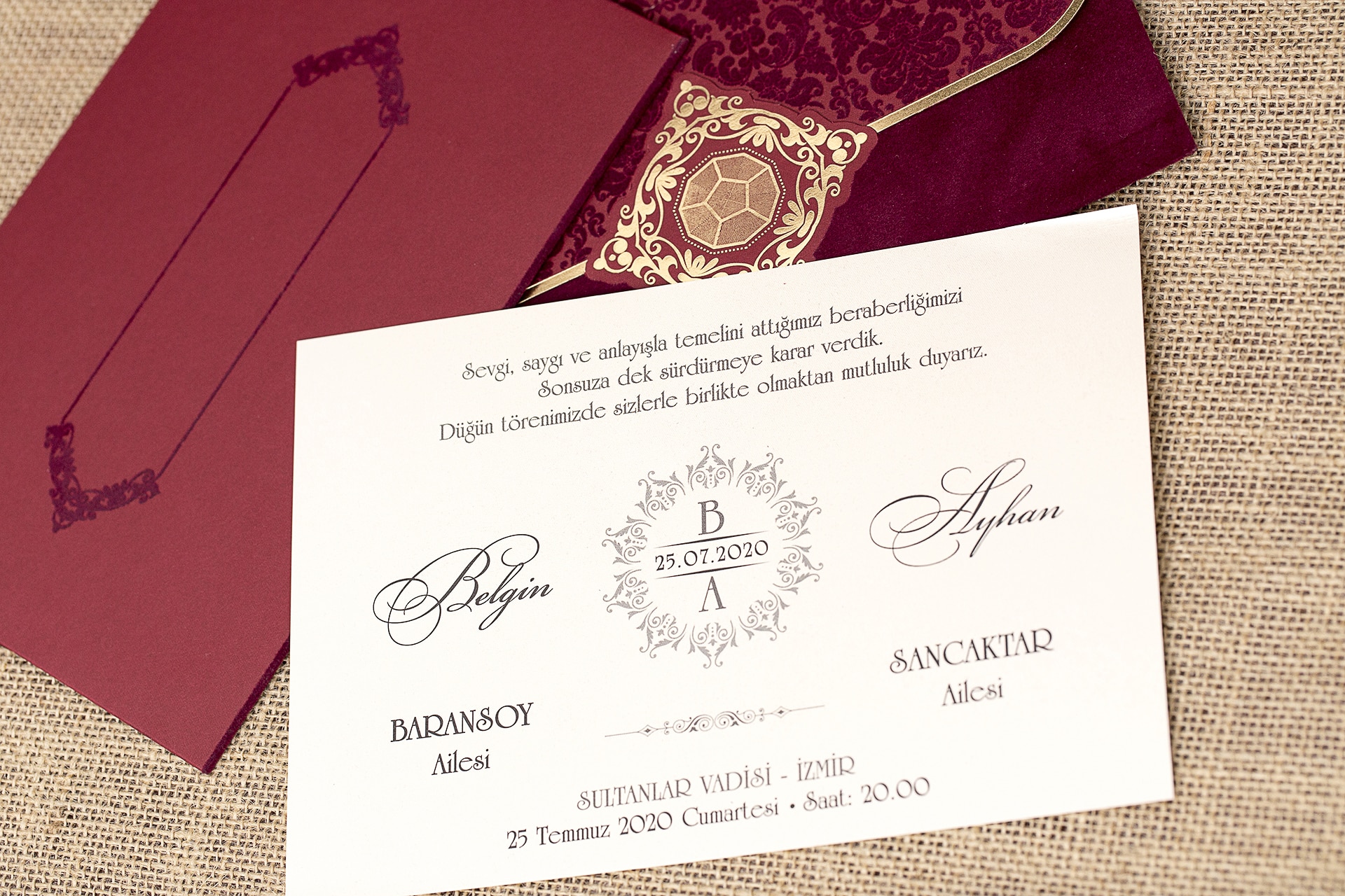 Inner print of the invitation includes the printing of the bride and groom names, invitation text, family names, date, time, and address information on the inside of the invitation.