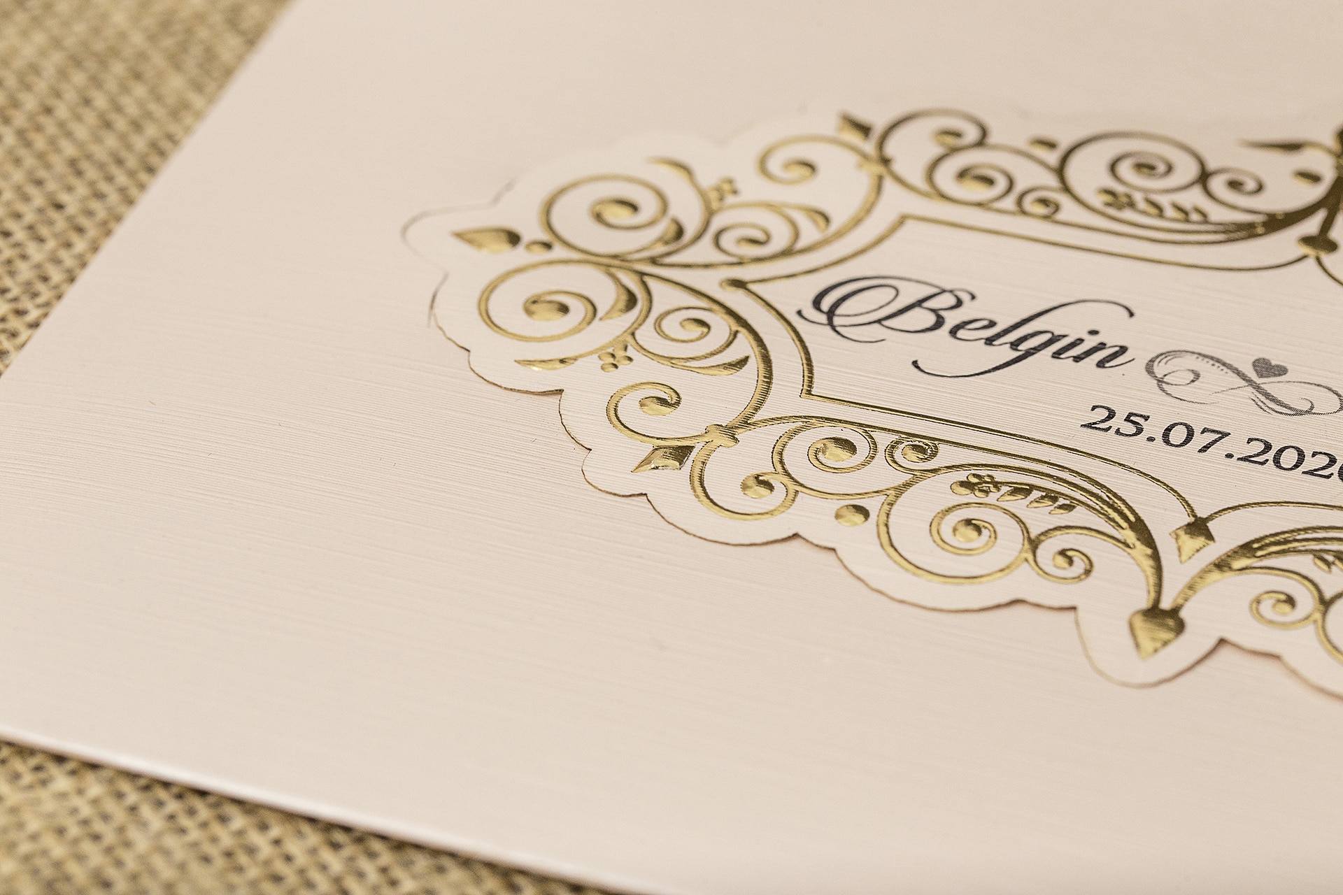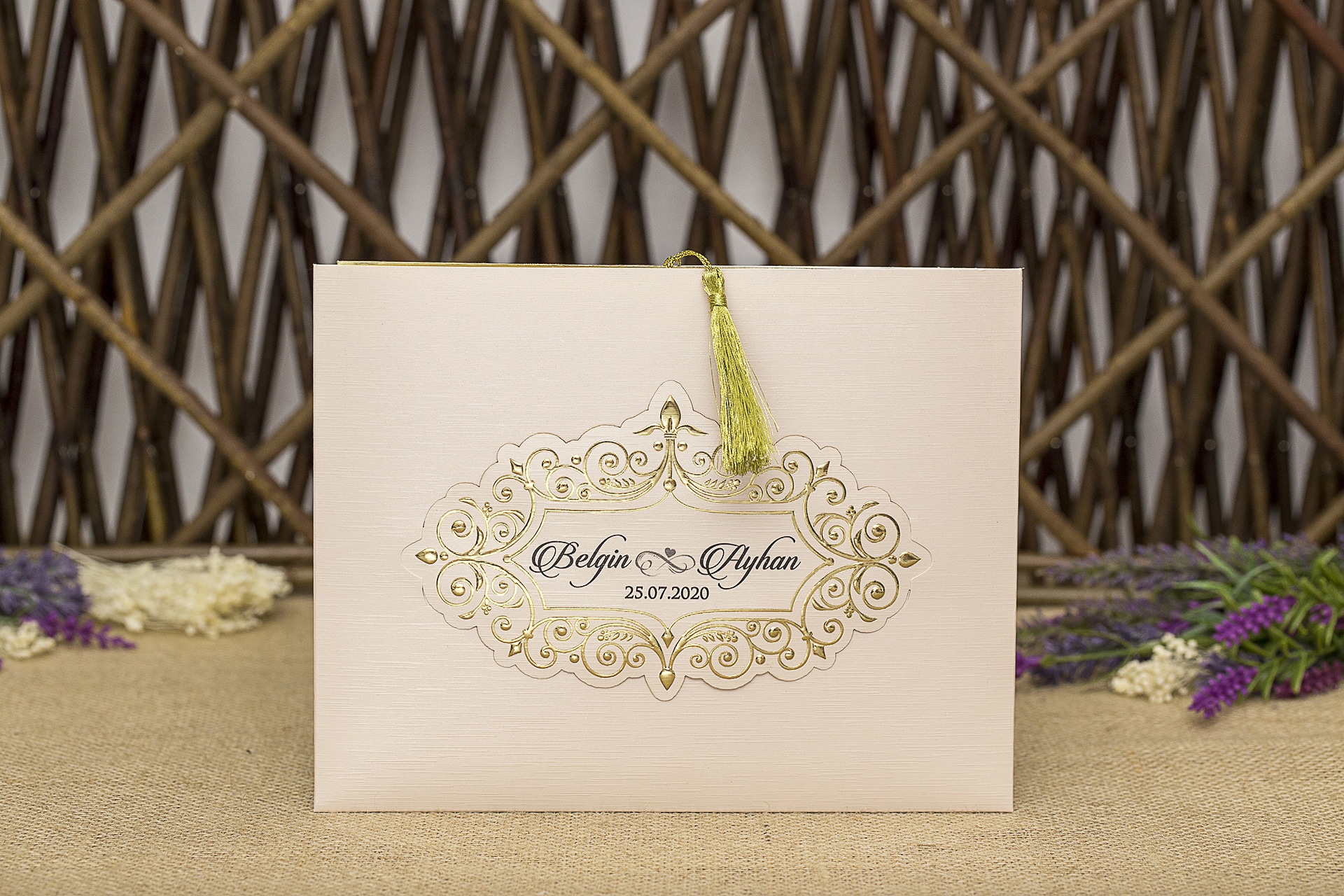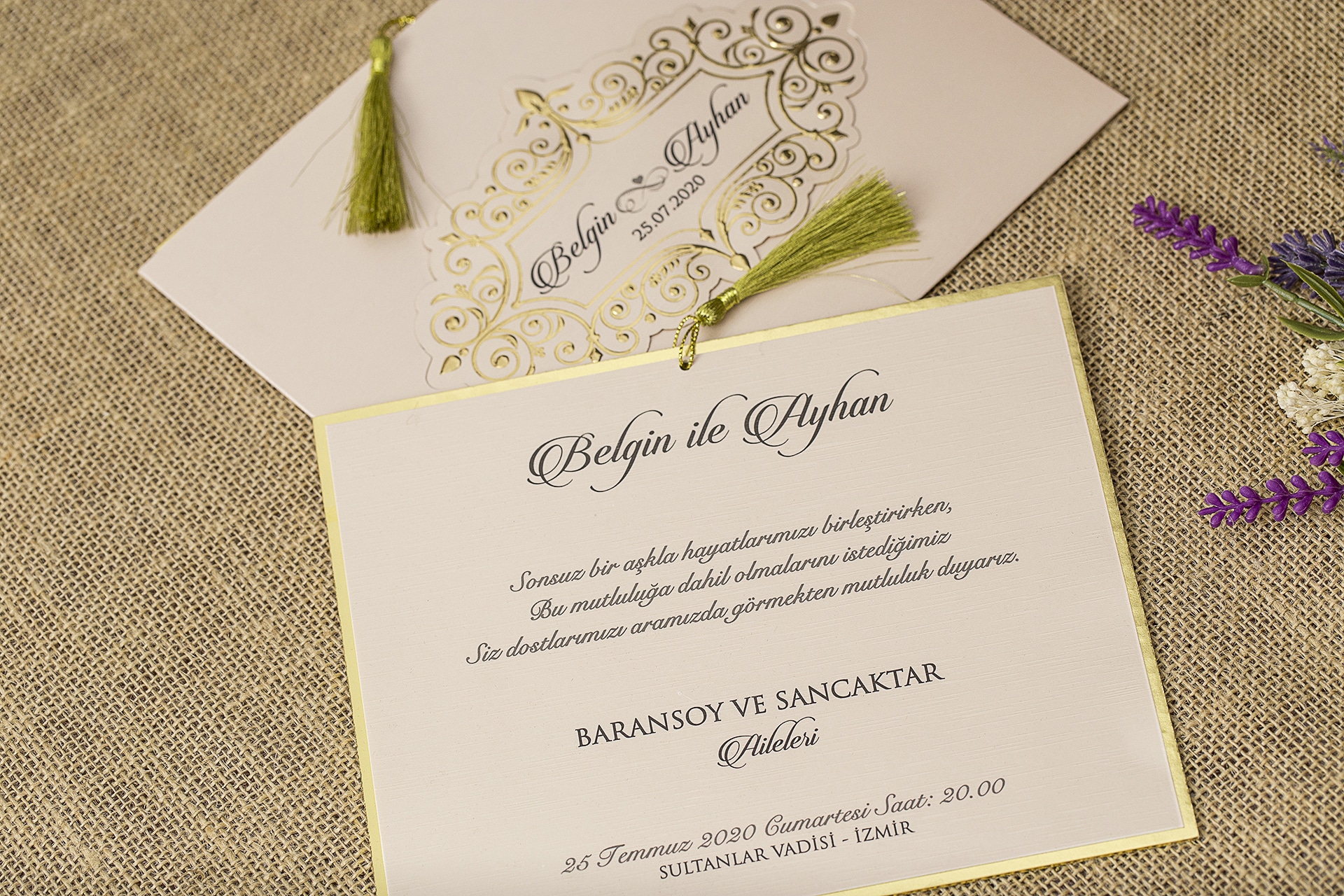 Inner print of the invitation includes the printing of the bride and groom names, invitation text, family names, date, time, and address information on the inside of the invitation.