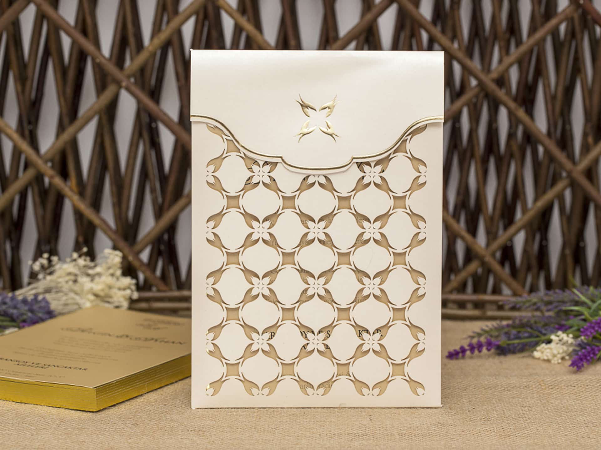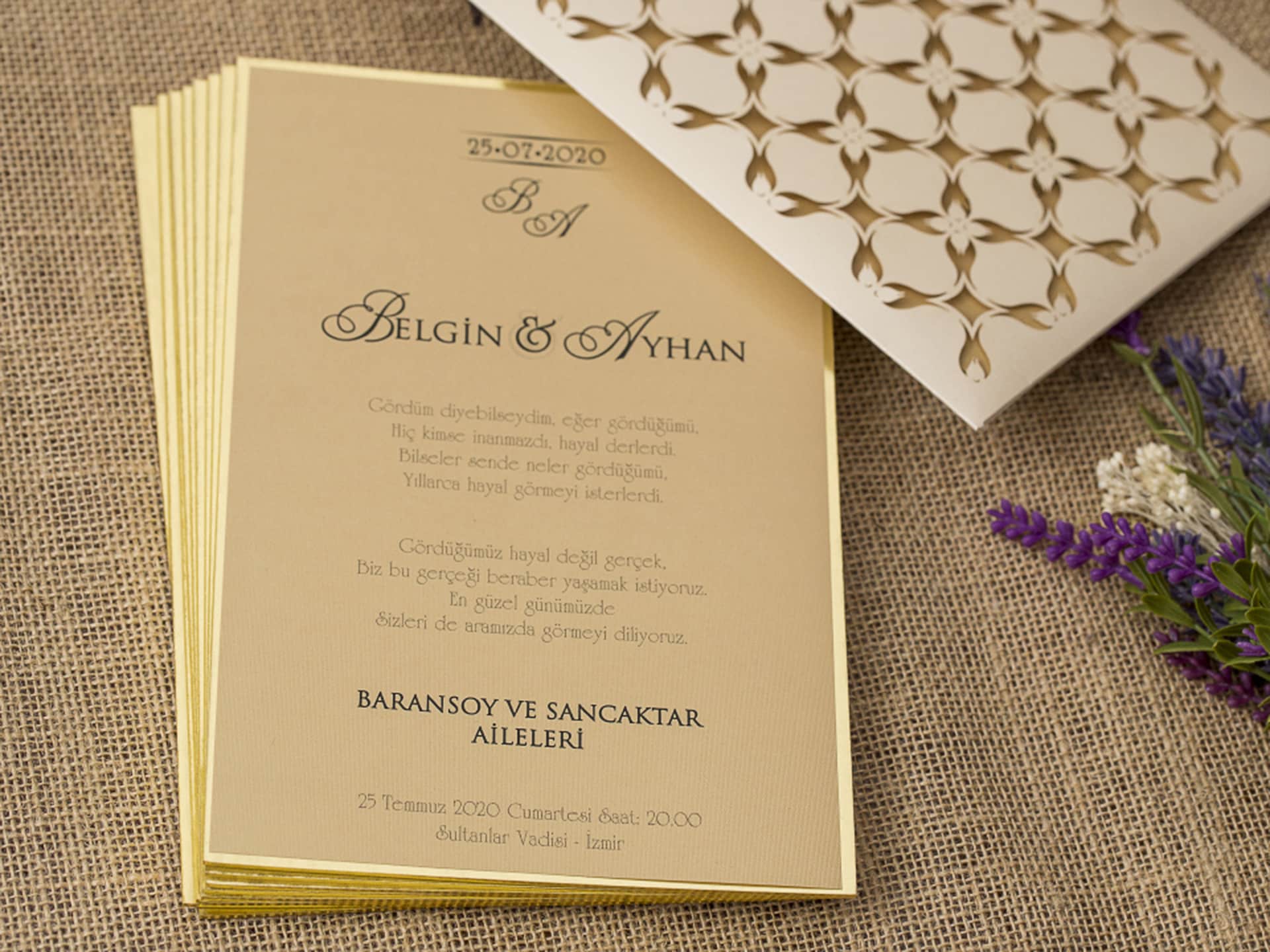 Inner print of the invitation includes the printing of the bride and groom names, invitation text, family names, date, time, and address information on the inside of the invitation.