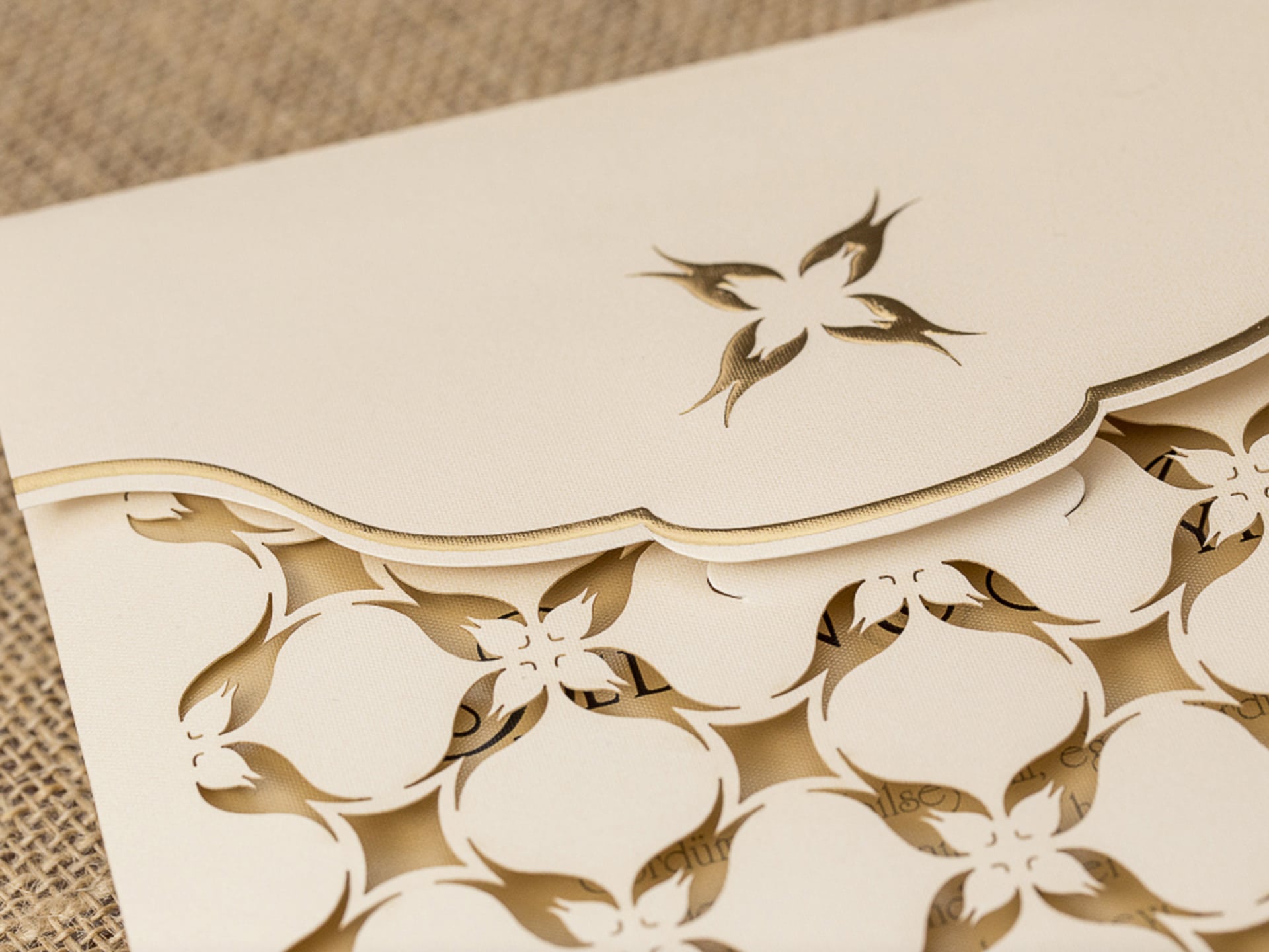 Envelope name printing is the process of printing the bride and groom’s names, initials, or date information on the top of the invitation envelope.