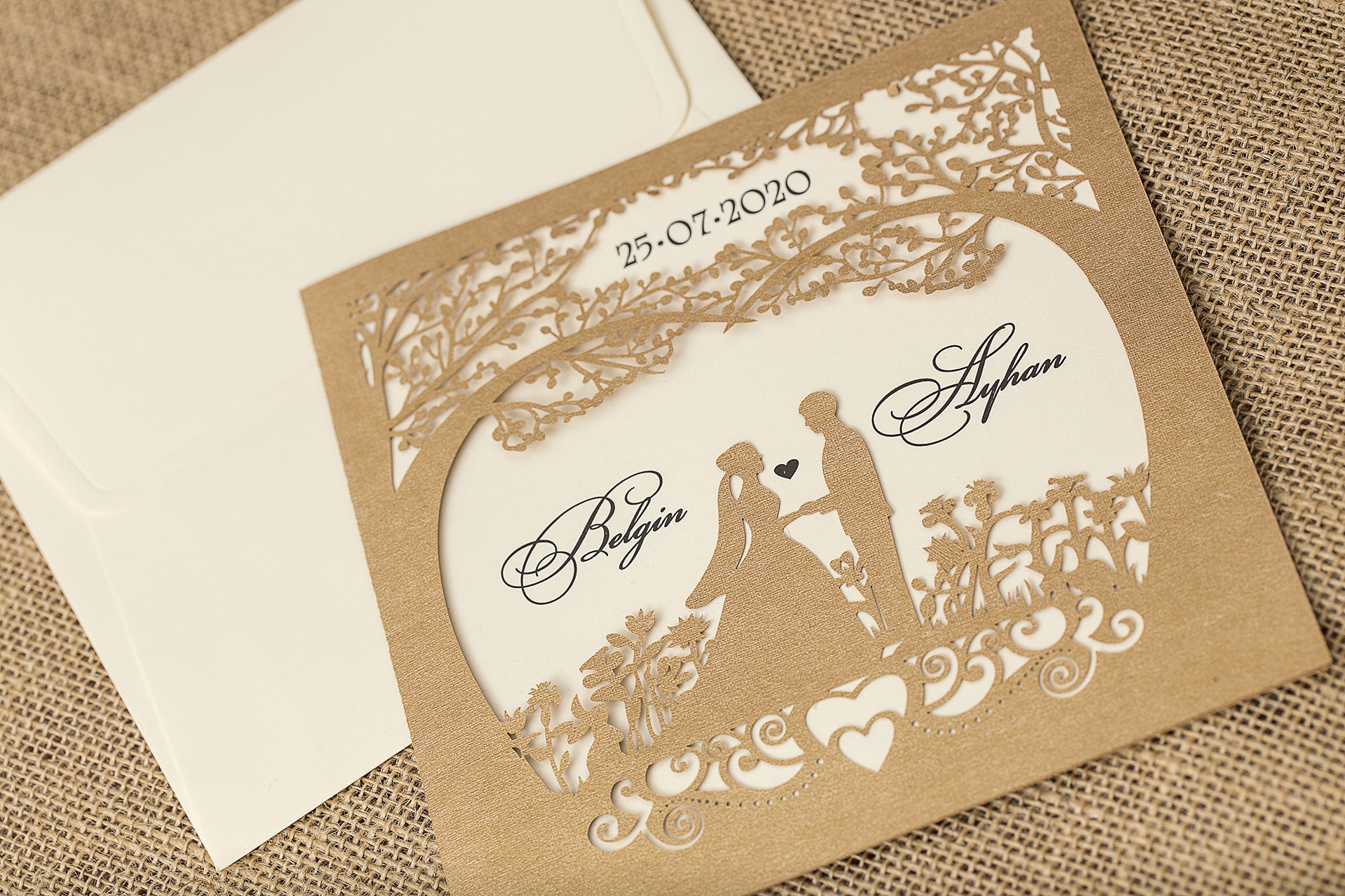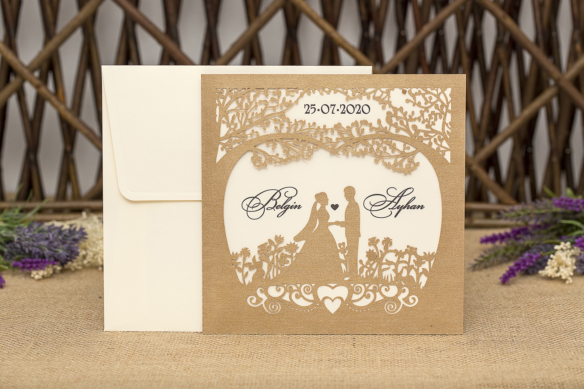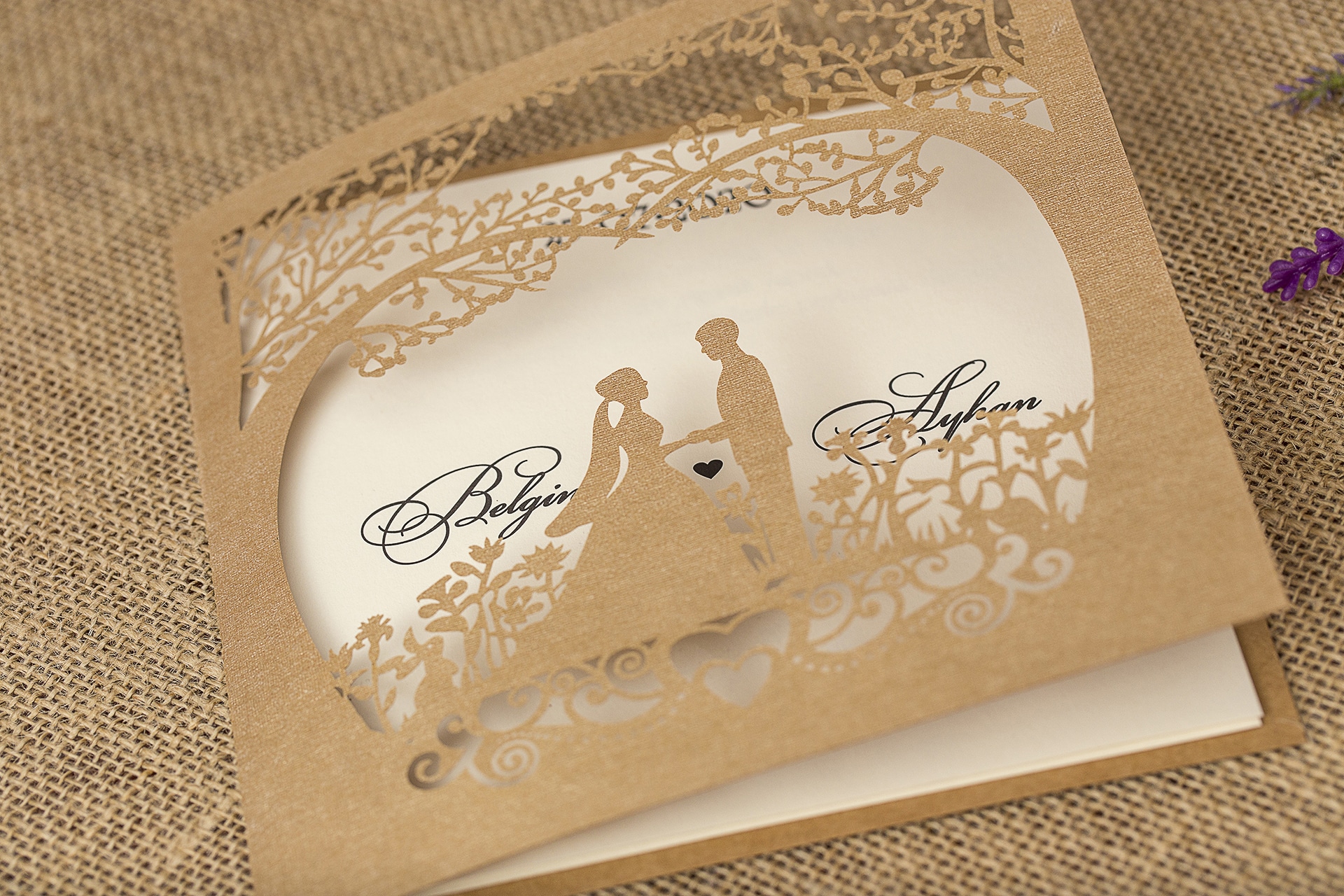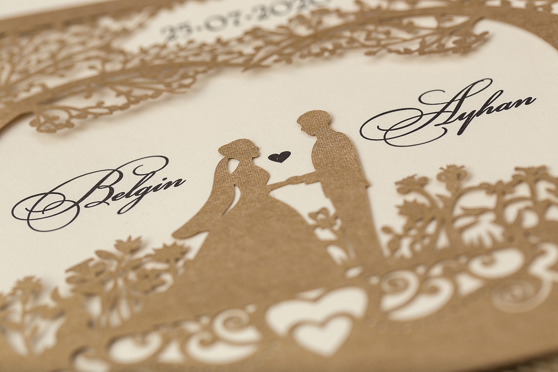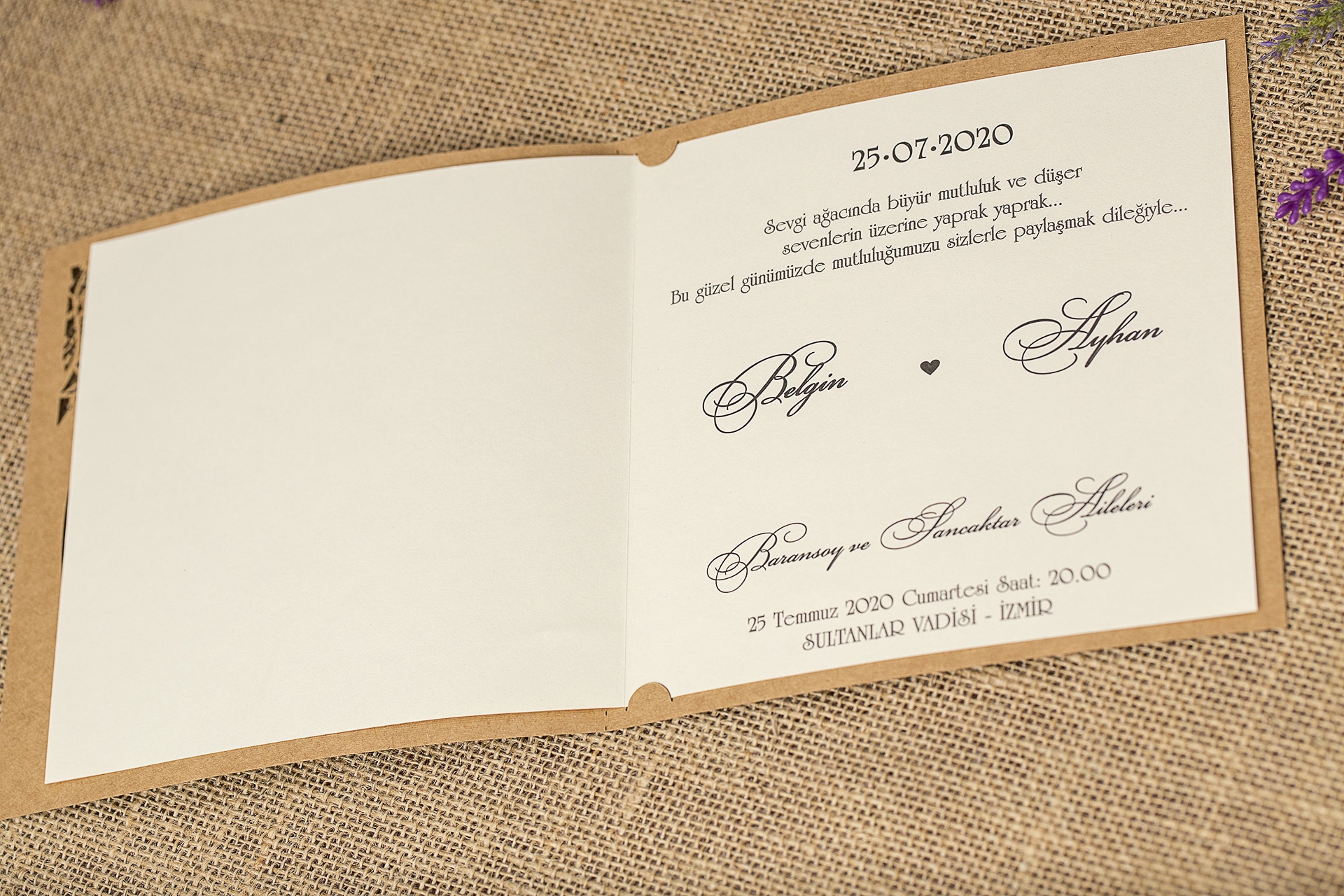 Inner print of the invitation includes the printing of the bride and groom names, invitation text, family names, date, time, and address information on the inside of the invitation.