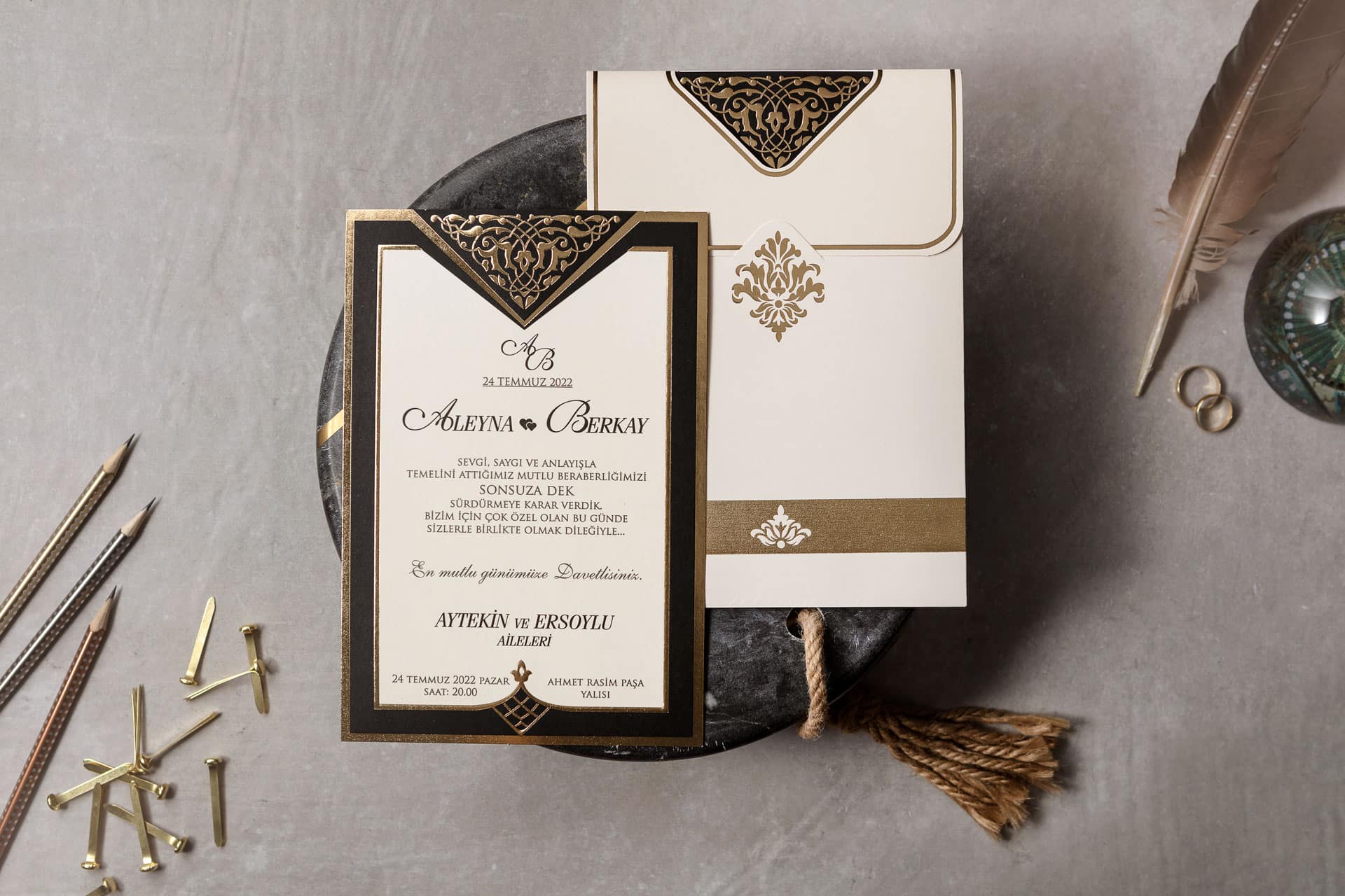 Inner print of the invitation includes the printing of the bride and groom names, invitation text, family names, date, time, and address information on the inside of the invitation.