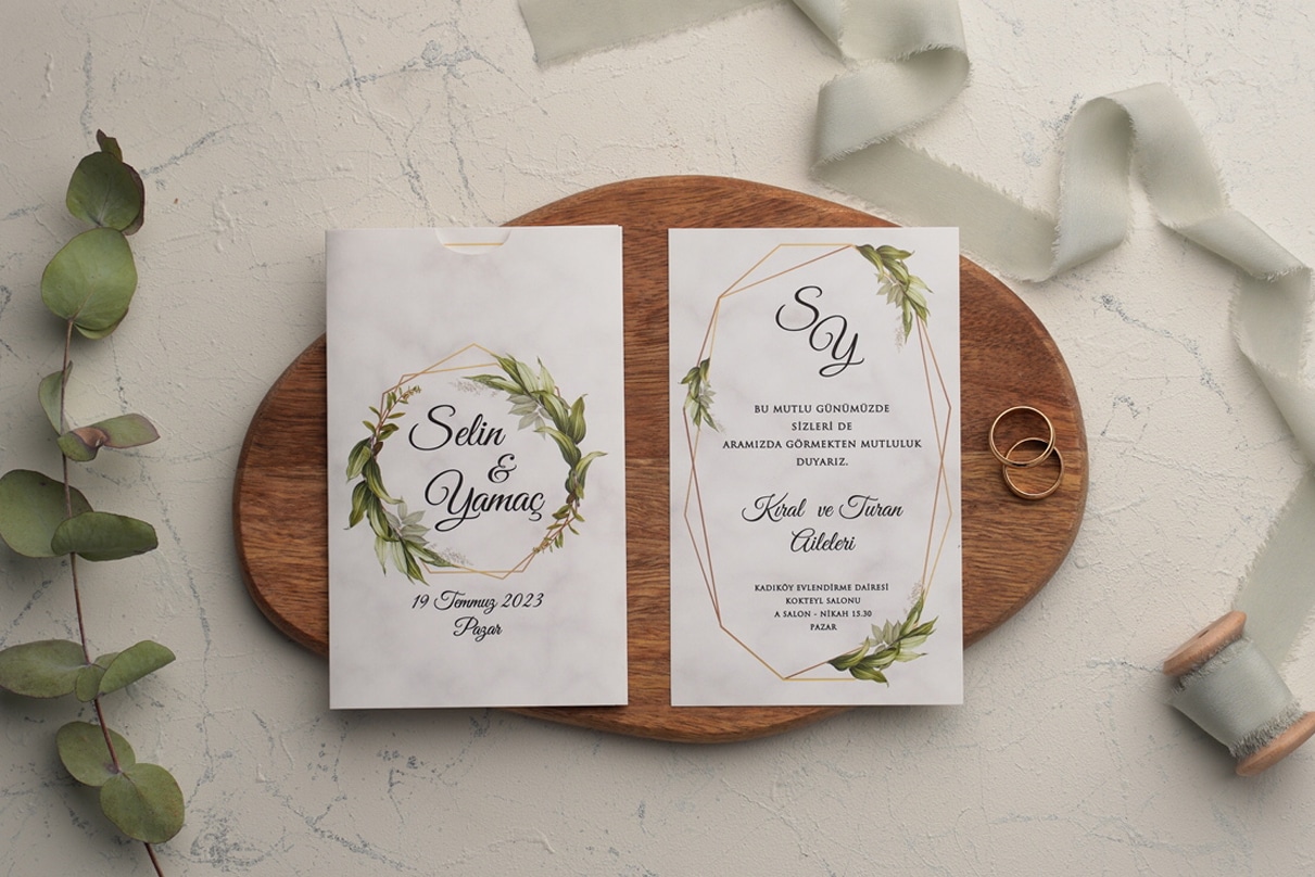 Inner print of the invitation includes the printing of the bride and groom names, invitation text, family names, date, time, and address information on the inside of the invitation.