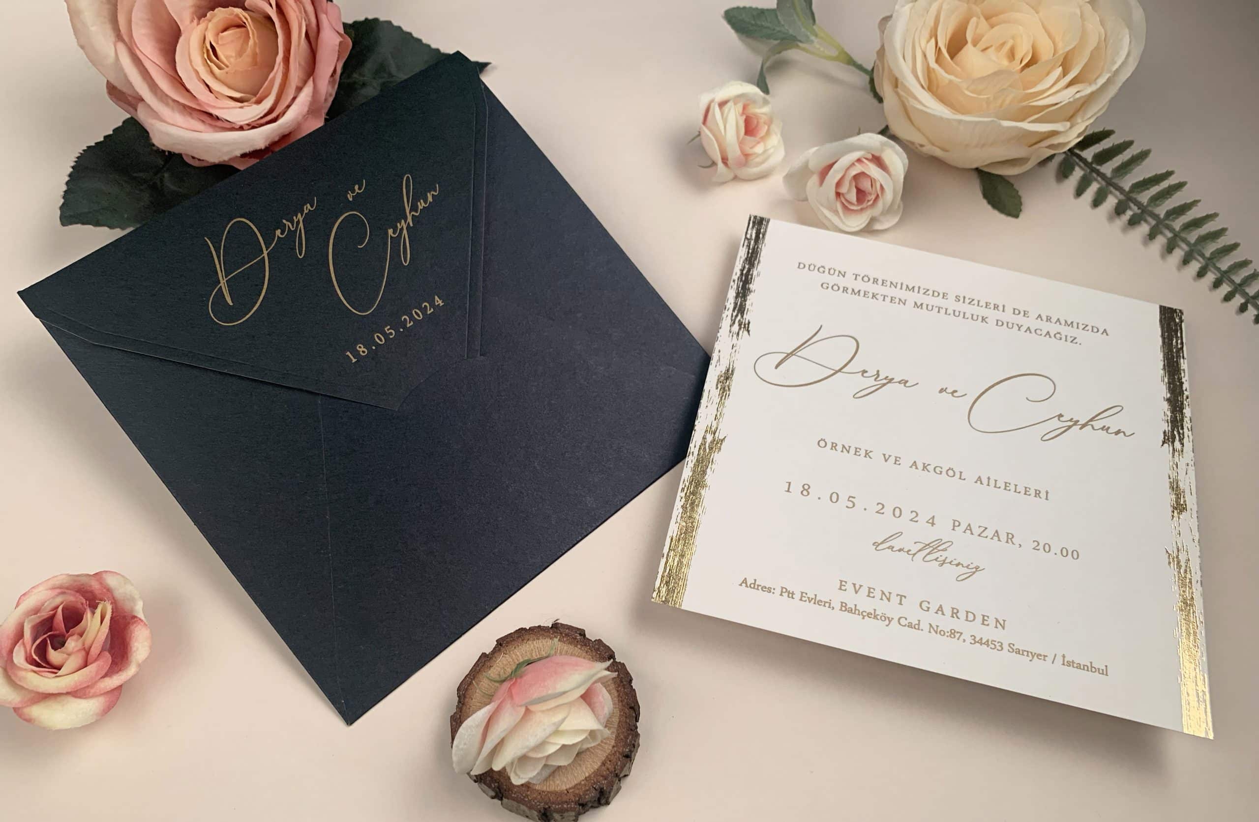 Envelope name printing is the process of printing the bride and groom’s names, initials, or date information on the top of the invitation envelope.