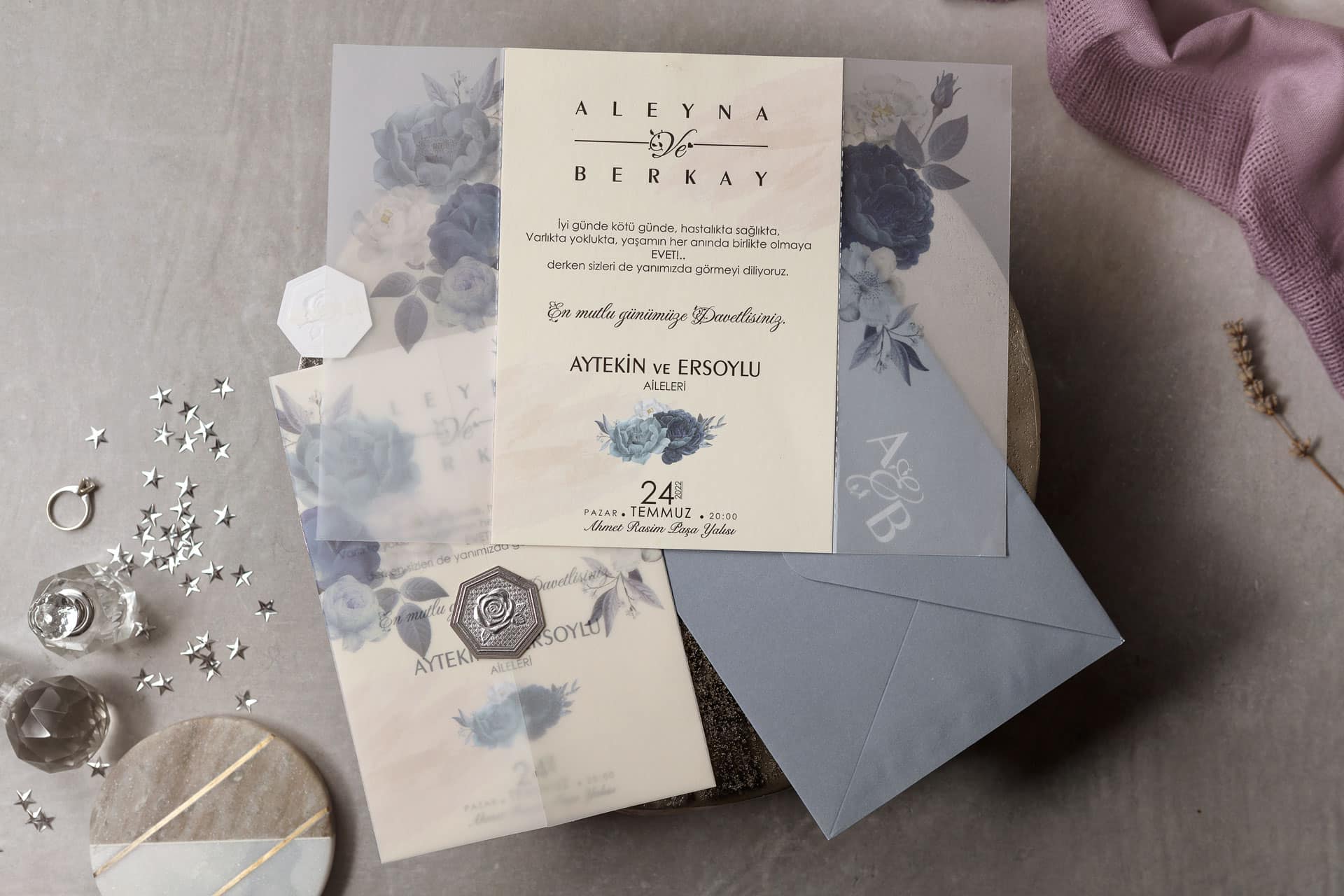 Inner print of the invitation includes the printing of the bride and groom names, invitation text, family names, date, time, and address information on the inside of the invitation.