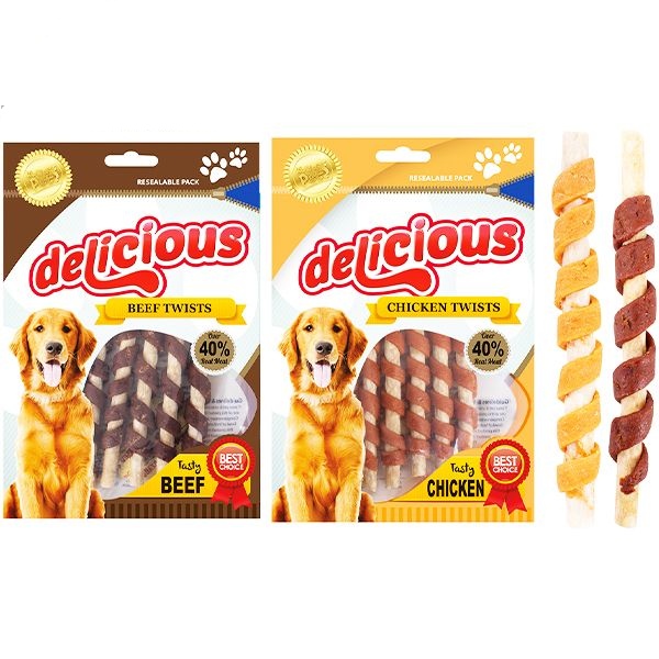 Chicken and beef twist sticks. Perfect for a tasty snack or for rewarding good behaviour.