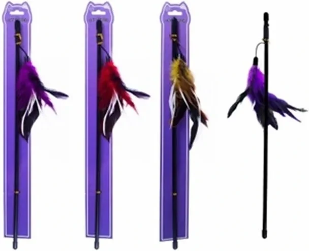 This playful toy features feathers of different colours and textures, making it irresistible for cats to chase and pounce. Its long wand design allows you to engage in interactive play with your feline friend, providing exercise and mental stimulation. The teaser toy has been made from safe and durable materials, it is built to withstand hours of playtime. It's perfect for single or multiple-cat households. The compact size of the toy makes it easy to store and carry, so you can take it with you on the go! Assorted Colours: Purple, Red or Yellow.